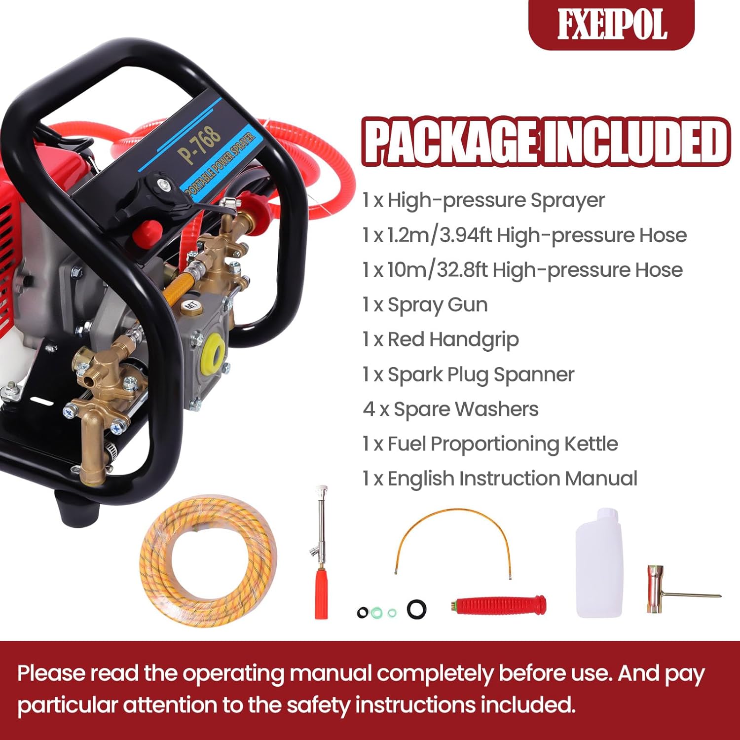 | Included Components | 1 x High-pressure Sprayer, 1 x 1.2m/3.94ft High-pressure Hose, 1 x 10m/32.8ft High-pressure Hose, 1 x Spray Gun, 1 x Red Handgrip, 1 x Spark Plug Spanner, 4 x Spare Washers, 1 x Fuel Proportioning Kettle, 1 x English Instruction Manual |