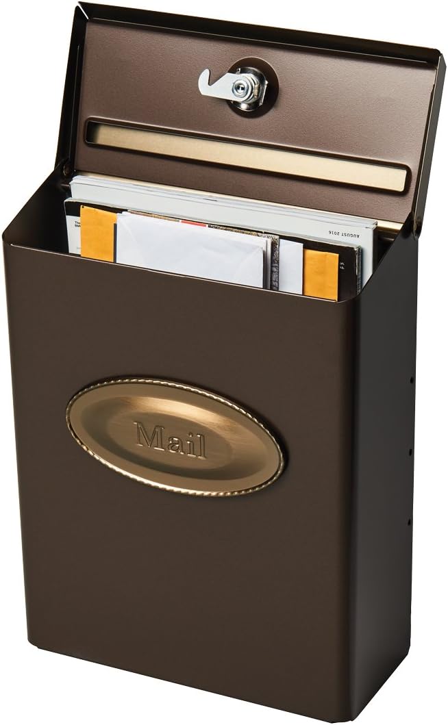 Carefully crafted for the ultimate in styling and security, the medium-sized Designer Locking Wall Mount Mailbox delivers on both aesthetics and functionality. Available in 5 colors, the rust-resistant galvanized steel construction is both durable and never goes out of style. The optional 'Mail' emblem allows you to customize the look and the concealed, locked compartment will keep your mail safe.