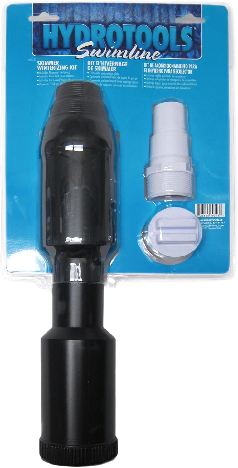 Ensure that your pool is always in good condition with this winterizing kit. Help prevent cracking of your in-ground or above-ground skimmer during the winter months with this accessory. It is a must for a neat and clean pool. Features:. Plug an intake or discharge plumbing line and attach a blower hose to your pool to remove the water from your plumbing to prevent damage caused by freezing pipes. Skimmer guard screws into and plugs both 1.5" and 2" threaded skimmer holes. Fits almost all brands. Kit includes: (1) 16" skimmer guard, (1) blow out hose adapter and (1) ice guard winter plug Dimensions: 16.5" H x 3.25" W x 3.25" D. Material(s): plastic