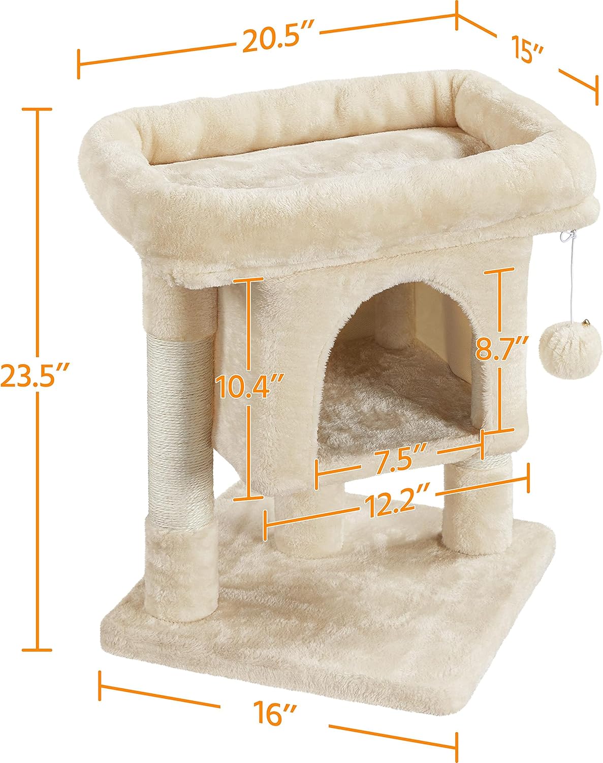 ✦FEATURE:✦Our cat tree features a plush wide perch, an elevated condo, and two scratching posts, which provide a piece of multifunctional cat furniture for your loved pets. ✦Crafted of durable materials and built in a solid structure, this cat tree will be a reliable playground for long-term use. ✦The whole stand is covered with soft and skin-friendly plush fabric, bringing ultimate comfort and keeping them warm all the time. ✦With the compact size, modern design, and neutral colors, this cat tower will be easily blended into different home decors and perfect for apartments and small spaces.✦SPECIFICATIONS:Material: P2 particle board, plush fabric, sisal ropeOverall dimension: 16x16x23.5'' (LxWxH)Condo size: 12.2x12.2x10.4'' (LxWxH)Top perch size: 20.5x15'' (LxW)Maximum load: 11 lbN.W.: 13.2 lbG.W.: 14.8 lbColor: Beige✦NOTE:1. Keep the cat tree dry.2. Pay attention to the fire.3. Keep the cat tree clean for your beloved cat.4. Please make sure the size of the product fits your pet before purchasing. This cat tree is recommended for small cats.5. Please allow 0.4inch errors due to manual measurements.✦PACKAGE INCLUDED:1 x Cat Tree1 x Instructions