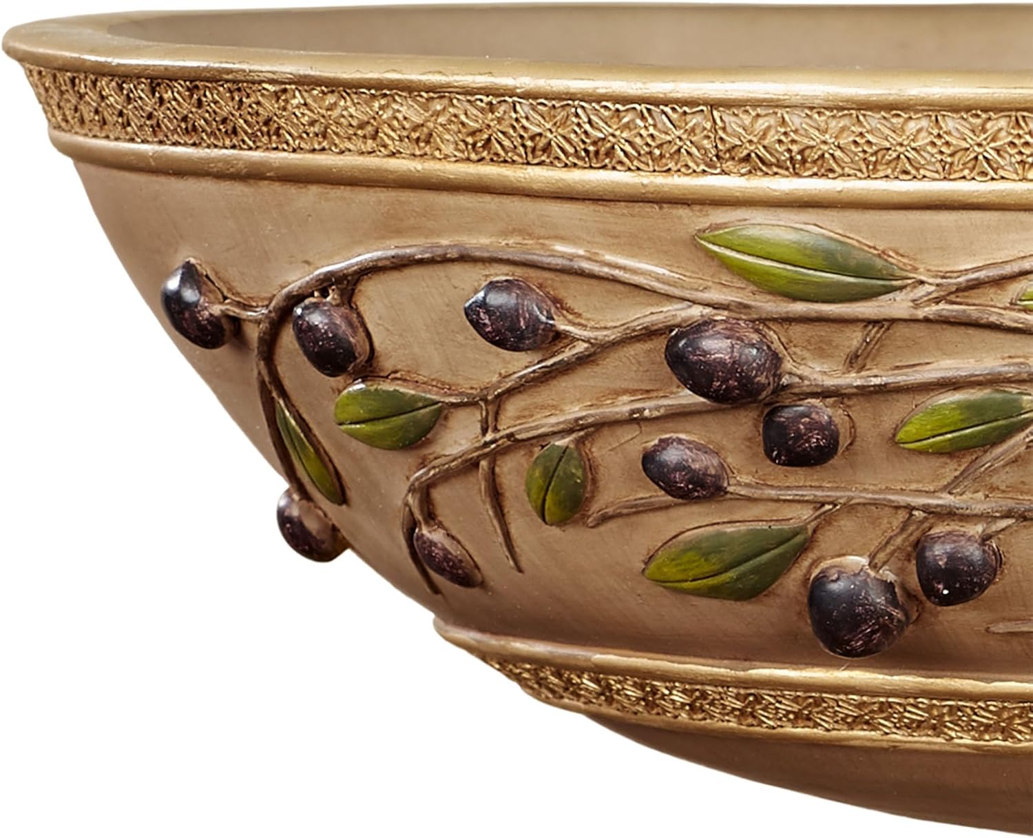 Vernazza Olives branch along this decorative centerpiece bowl, adding an Italian touch to your decor. The aged tawny resin accent features golden details, decorative medallion borders, and raised branches with budding leaves and olives. A square footed base complements the shaped design. Decorative use only. Centerpiece bowl measures 12.5 dia.x9.5 H. Design exclusive for Touch of Class(R)! Raised olive branch motifs Detailed medallion borders Decorative centerpiece bowl.